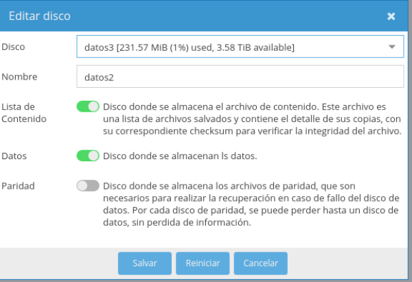 Por último vamos a cambiar el disco datos2 para convertirlo en un disco de paridad. Lo ideal es desmontarlo, formatearlo y volverlo a crear como disco de paridad