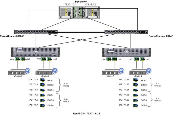 La cabina iscsi está conectada a dos switch powerconnect 8024F dedicados en exclusiva para el tráfico ISCSI, conectados estos a su vez a dos servidores vsphere .