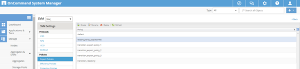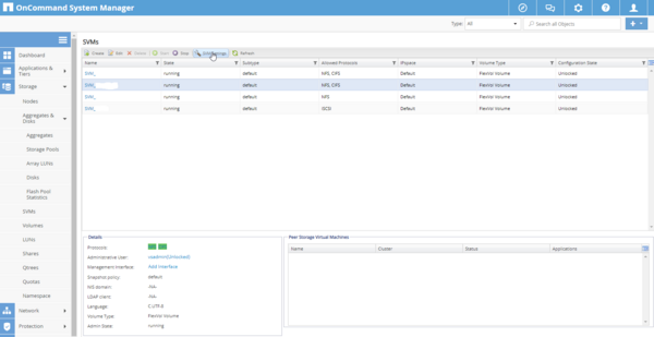 Las políticas de acceso se definen a nivel de SVM (Storage Virtual Machines), también conocidas como Vservers. Para definir una política de acceso vamos al OnCommand System Manager → Storage SVMs → Seleccionamos la SVM sobre la que vamos a ahacer los cambios y pinchamos en el icono SVM Settings