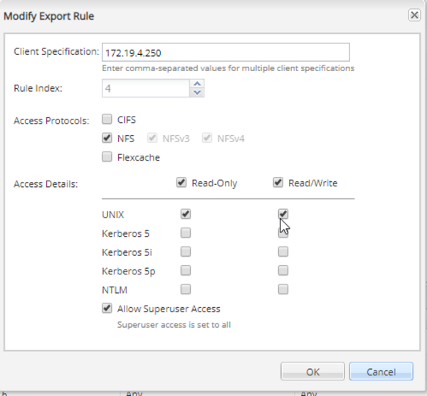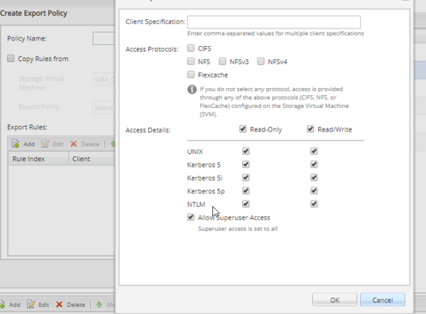 Una vez dentro de las opciones de la SVM vamos a Policies → Export Policies y pinchamos sobre el icono create para crear una nueva política y en export rules añadimos las opciones por las que se va a conectar el cliente