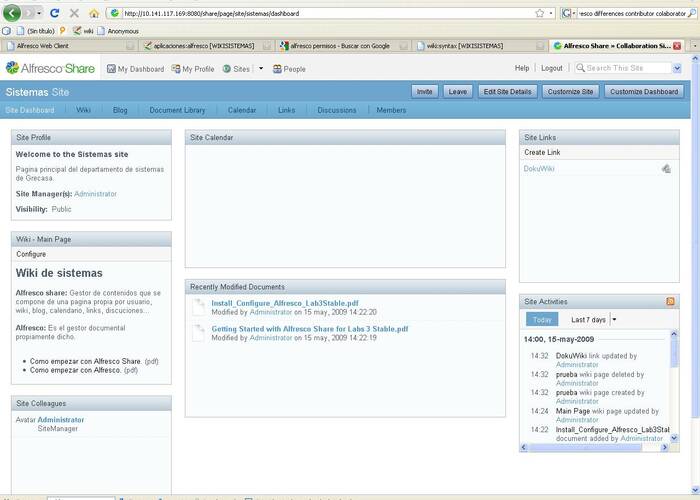- http://ip:8080/share para la parte compartida del gestor (wiki, blogs, perfiles de usuarios…). Aunque tambien puedes subir, bajar, editar archivos.