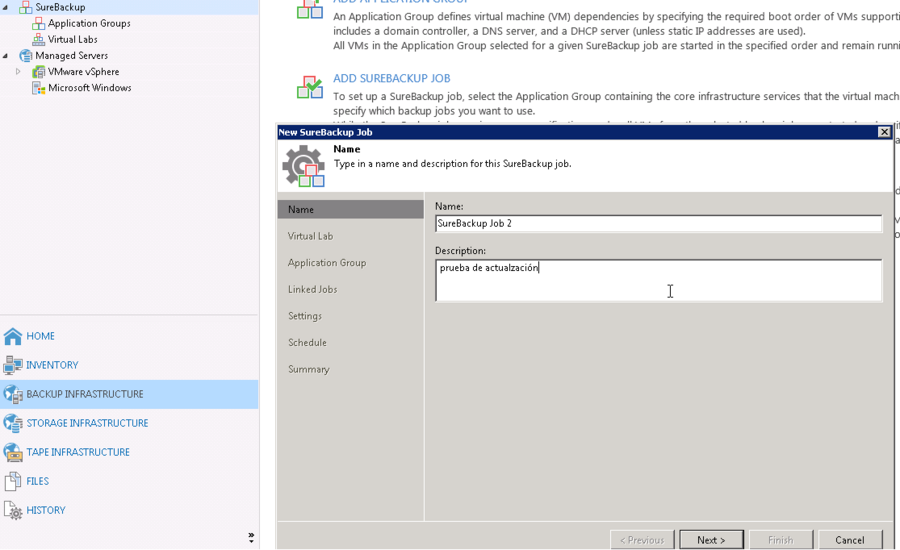 Por último, sólo faltaría crear la tarea en la que enlazaremos el Virtual Lab que hemos creado con el Aplicattion Group. Para ello vamos a la opción de menú SureBackup y pulsamos sobre ADD SUREBACKUP JOB