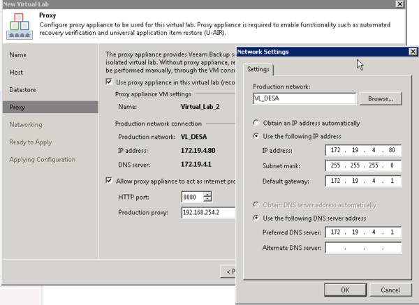 Como a su vez quiero que las máquinas de los laboratorios puedan conectar a internet a través de esta, marcamos la casilla Allow proxy appliance to act as internet proxy for virtual machines in this lab y definimos los parámetros de nuestro internet proxy de producción.