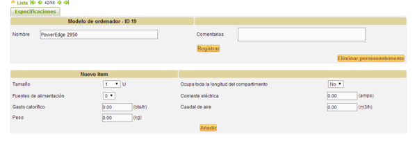 De los datos que vemos en la imágen podemos destacar el tamaño (por defecto 1 U), la anchura, altura, peso y profundidad.