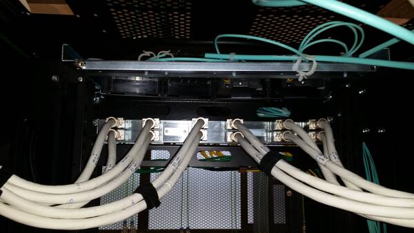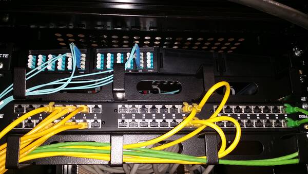 Vista posterior de las conexiones del Rack con 24 conexiones de fibra y un panel de 48 bocas a 10 Gb