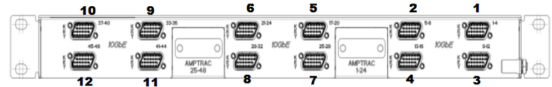El panel tiene en su parte trasera 12 conectores MRJ21 y en su parte delantera 48 puertos de 10 GB en un espacio de 1 U