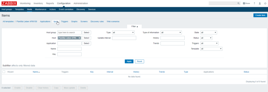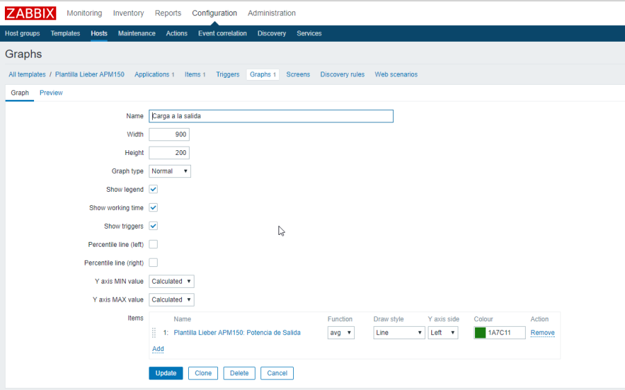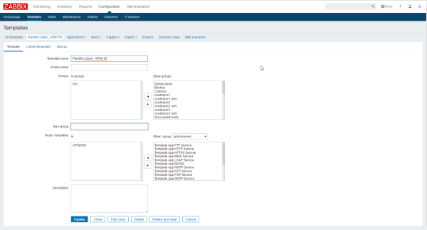 En este caso vamos a crear una plantilla con una serie de items y triggers para monitorizar una SAI Libert APM 150. Para ello en la pestaña Configuration→Templates y pulsamos en el botón Create Template