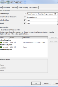 Para la service console hay que hacer un cambio ya que no permite que las dos tarjetas esten en active. Para ello editamos dentro del vswitch el Management Network. En la pestaña NIC Teaming marcamos la opción Overrride switch failover order y ponemos una de las tarjetas en stanby y como método de load balancing: Route based on the originating virtual port ID