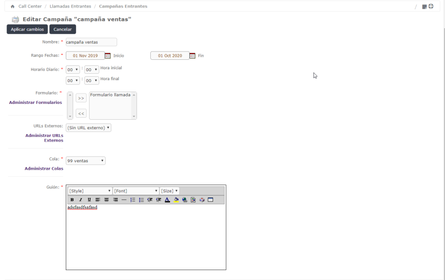 Definimos un nombre, las fechas y horas en las que estará activa la campaña, los formularios a usar, la cola asociada y el guión o diálogo para el agente