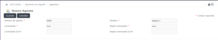 Call Center→Opciones de Agente→Agentes→Nuevo agente Añadimos el número de agente, un nombre y una contraseña numérica.