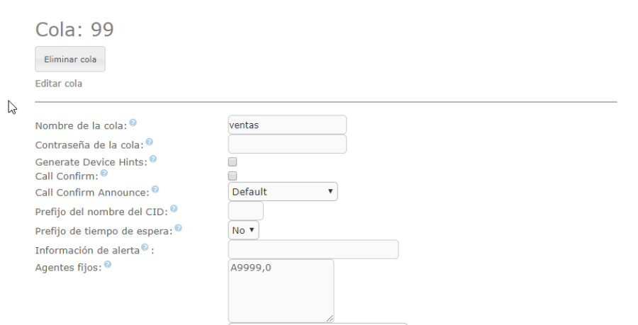 Creamos la cola en PBX→Configuración PBX→Colas→Añadir Cola Le ponemos un número y un nombre a la cola y en la opciónAgentes fijos añadimos los agentes con la siguiente sintaxis: Annnn,p