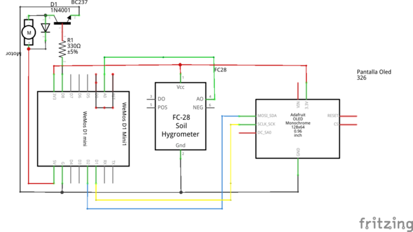 La idea de este proyecto es crear un sistema de riego automático que funcione independiente de una toma de agua. Para ello utilizaremos un motor sumergible que meteremos dentro de una garrafa y un wemos con display oled para controlar todo el sistema.