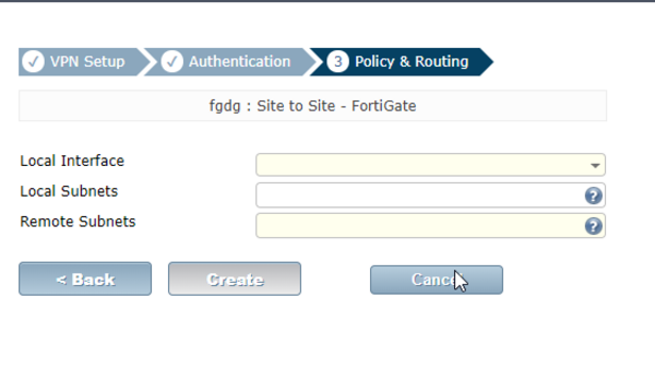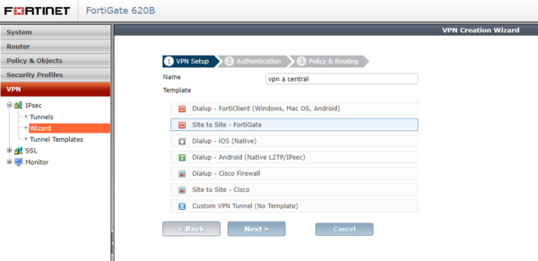 Utilizamos el asistente para realizar la configuración. Para ello vamos al menú de la izquierda y seleccionamos VPN→IPsec→Wizard y seleccionamos la opción Site to Site - Fortigate