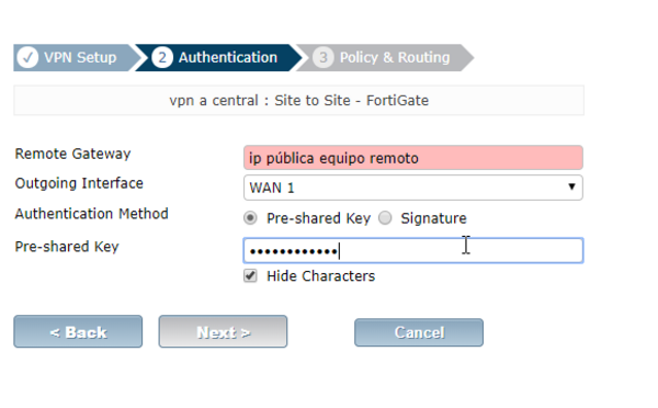 Definimos en remote gateway la ip pública del equipo al que vamos a conectarnos, la interfaz de salida por la que vamos a conectar y el tipo de autenticación que vamos a usar en ambos extremos.