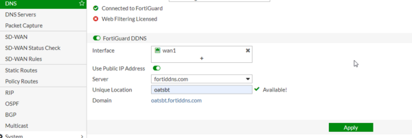 Lo primero es activar la opción en el menú Network → DNS y habilitamos la opción Fortiguard DDNS.