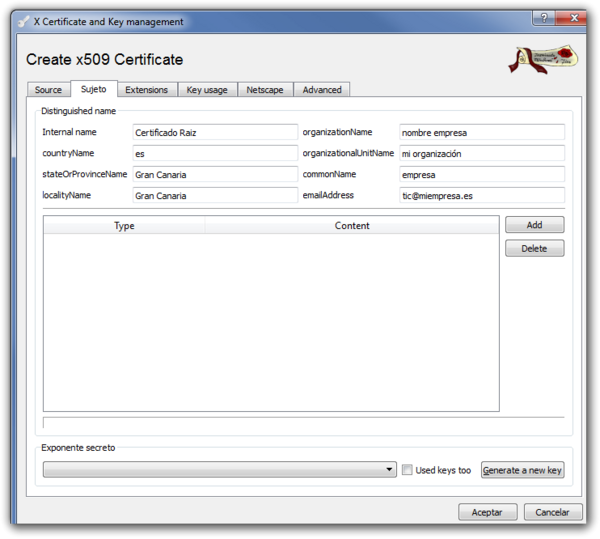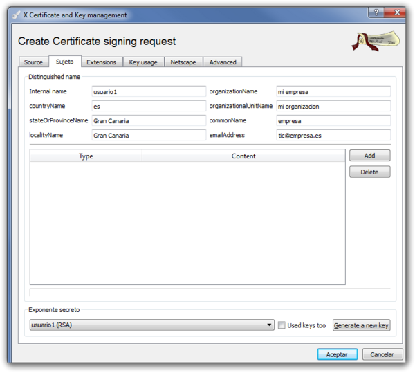 Abrimos el XCA → Pestaña Certificate signing requests → New Request En la ventana que se abre → Pestaña Subject → Rellenamos los campos y pulsamos sobre el botón generate a new key