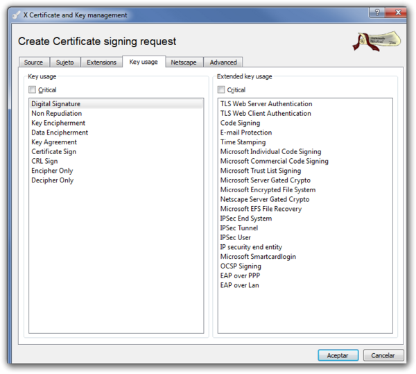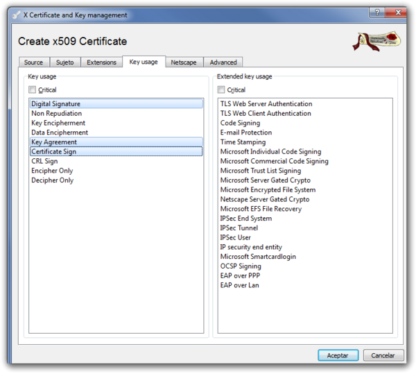 En la pestaña Key usage no hace falta ahora seleccionar nada