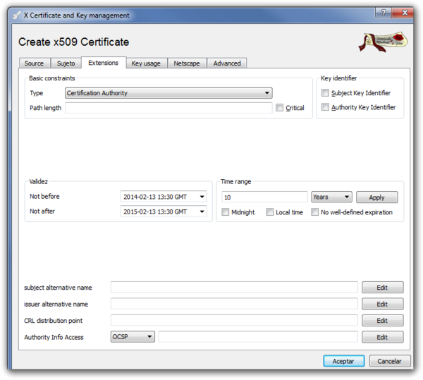 Verificamos que en la pestaña Extensions la validez que queremos darle al certificado y pulsamos sobre aceptar