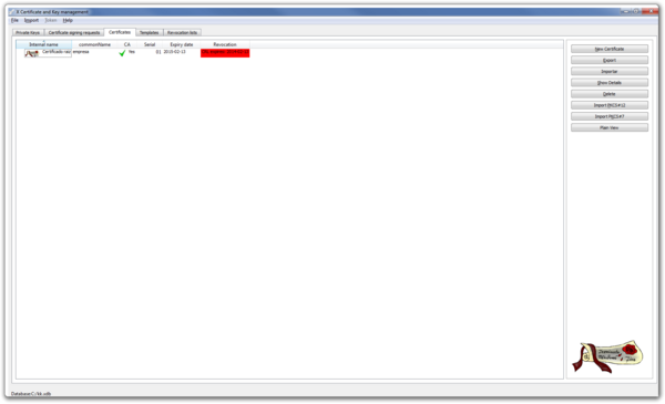 En XCA cada CA (Autoridad Certificadora)se almacena en un fichero con extensión *.xdb. Se recomienda usar distintas bases de datos para cada PKI (Infraestructura de clave pública) que creemos.
