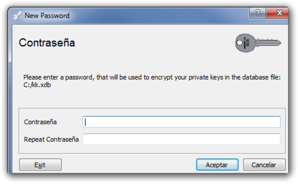• Nos aparece una ventana donde debemos poner una contraseña para encriptar el fichero de la base de datos. Esa contraseña es necesaria para cada vez que vayamos a abrir esa base de datos.