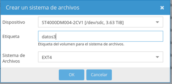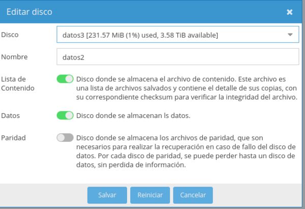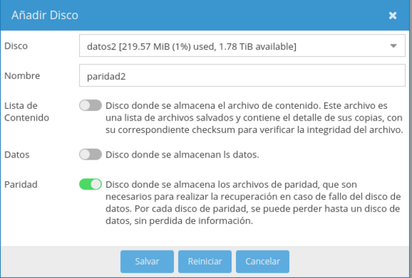 Por último vamos a cambiar el disco datos2 para convertirlo en un disco de paridad. Lo ideal es desmontarlo, formatearlo y volverlo a crear como disco de paridad