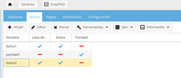 Ahora debemos de ir al OMV → Servicios →Snapraid → Discos