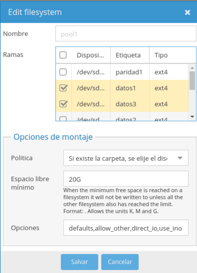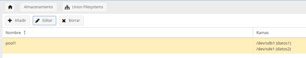 En mi caso como además tengo montado un pool con Unionfilesystems debo de editar el pool para cambiar las particiones asignadas al mismo. Vamos a la GUI del OMV en Almacenamiento → Union FileSystems