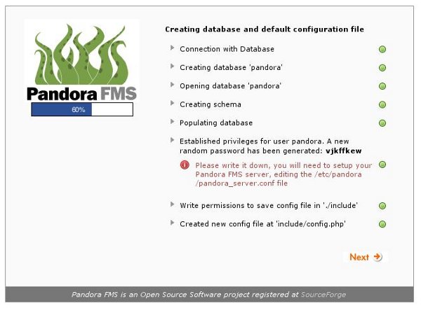 Con esto podemos entrar vía web con la IP del servidor en el navegador para terminar la instalación de Pandora. En este paso se crea la base de datos y se