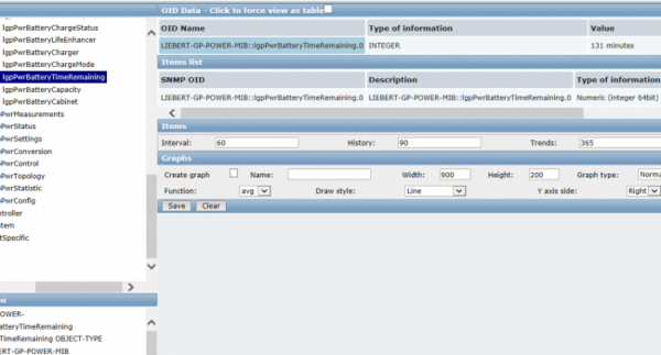 Si seleccionamos uno de los ítems del “OID tree”, a la derecha en “OID name” se nos mostrará el nombre, el tipo de dato y el valor del mismo (en el caso de que exista algún valor). Clicamos dos veces sobre el nombre del OID y aparecerá abajo en “Ítems list”. Por último, podemos seleccionar el intervalo en el que se va a recoger los datos del ítem y crear una grafica sobre el mismo si así lo deseamos (estos dos elementos pueden modificarse más tarde).
