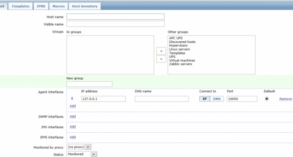 - Agent interfaces: aquí seleccionaremos el agente por el cuál queremos monitorizar nuestro equipo, en nuestro caso por SNMP interface. Clicamos en “add” y debemos indicar la IP o el nombre DNS del equipo (el puerto del SNMP es el 161).