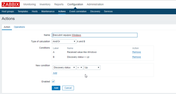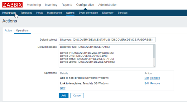 Para configurar una regla de auto-discovery vamos a Configuration→Actions y en el desplegable Event Source seleccionamos Discovery