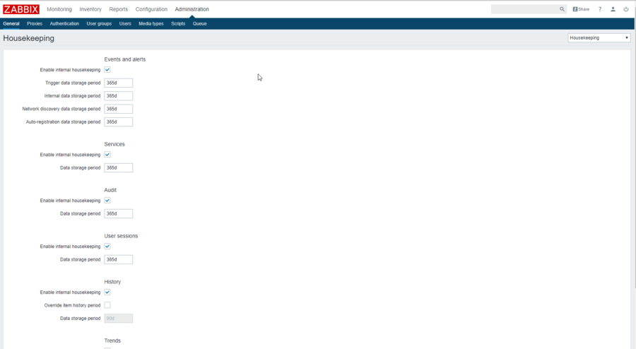 Para cambiar el número de eventos y alertas que mantenemos guardados tenemos que ir a al menú Administration→General y en el desplegable de la derecha seleccionar Housekeeping.