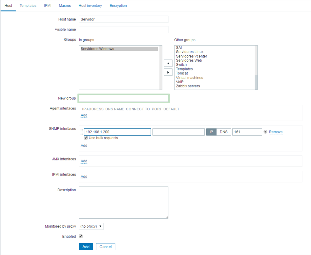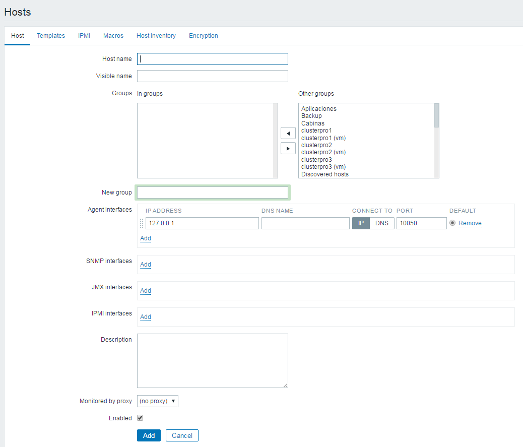 En el campo host name ponemos un nombre descriptivo. En la casilla groups seleccionamos o creamos el grupo donde queremos encuadralo.
