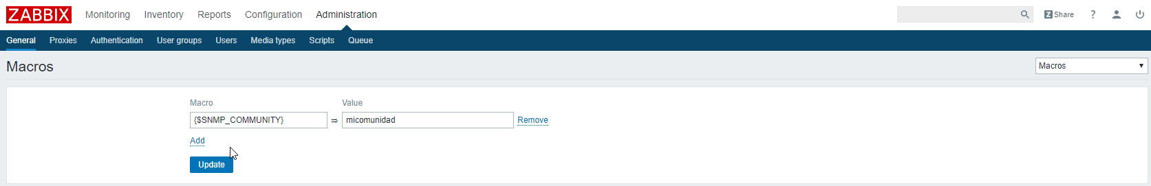 Lo primero sería definir nuestro nombre de comunidad por defecto. Para ello vamos a Administration→General y en la ventana de la derecha seleccionamos Macros y añadimos el siguiente macro: