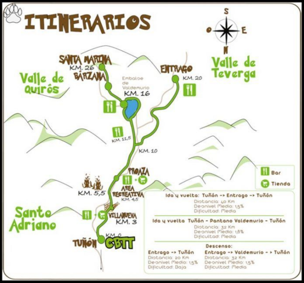 Si vamos a alquilar una bici con servicio de recogida, lo mejor es comenzar en Entrago e ir en bajada hasta Tuñon. Otra opción sería desviarnos en el pueblo de Caranga de Abajo y visitar el Embalse de Valdemurio, o si tenemos fuerzas llegar hasta Santa Marina y volver a bajar a Tuñón