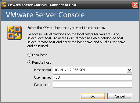 Y ya tenemos instalado vmware server. Para acceder remotamente desde otro ordenador debemos de instalar en el cliente la consola VMWARE y pulsar sobre conectar remotamente con otro host