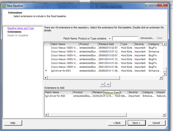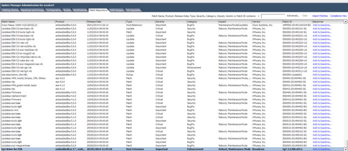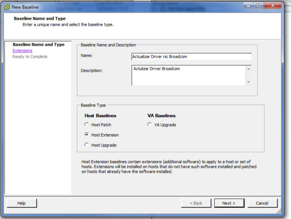 Una vez en nuestro repositorio ya sólo bastaría con crear una nueva baseline o añadirla a una ya existente. En nuestro caso creamos una nueva baseline y se la asociamos a los esxi que tengan ese tipo de tarjeta.