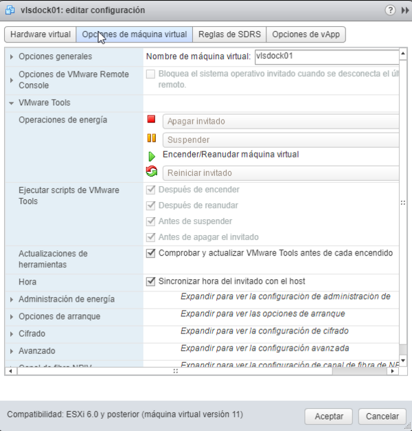 • Deben de tener instaladas las vmwae tools y editar las propiedades para su sincronización con el host esxi