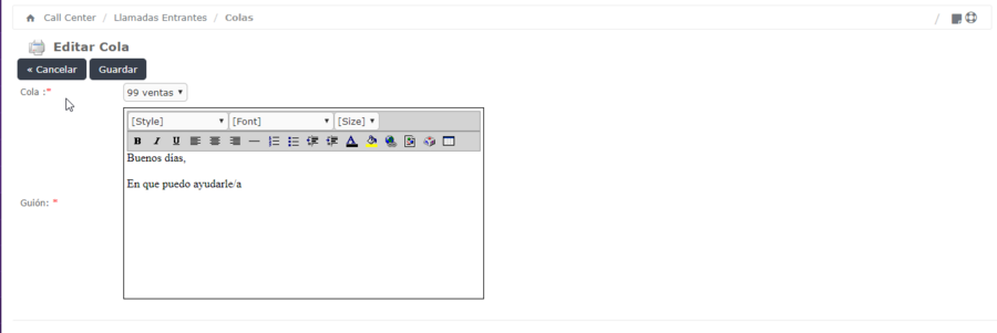 Seleccionamos la cola que habíamos creado y añadimos un guión que se le mostrará al agente y le servirá de guía.
