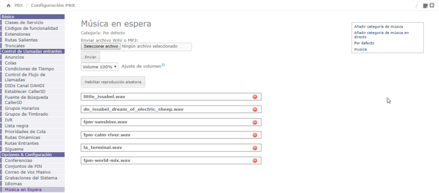 Para gestionar la Música en Espera tenemos que ir a PBX–> Configuración PBX → Opciones & Configuración → Música en Espera