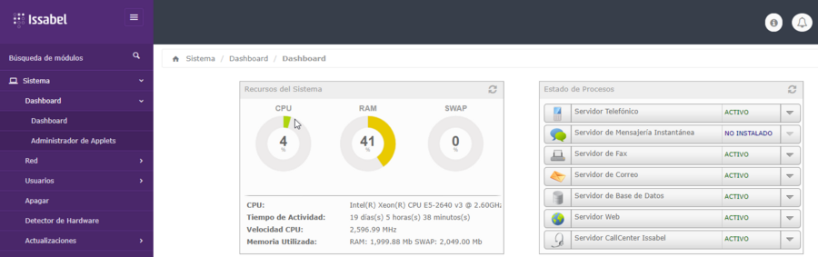 Para configurar el fax en Issabel lo primero es verificar que el servicio está instalado y en ejecución. Nos validamos como administrador en nuestra centralita y vamos a Sistema→Dashboard→Dashboard
