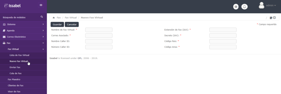 Creada la extensión lo siguiente sería crear un nuevo fax virtual, para ello vamos a la opción Fax→Fax Virtual→Nuevo Fax Virtual