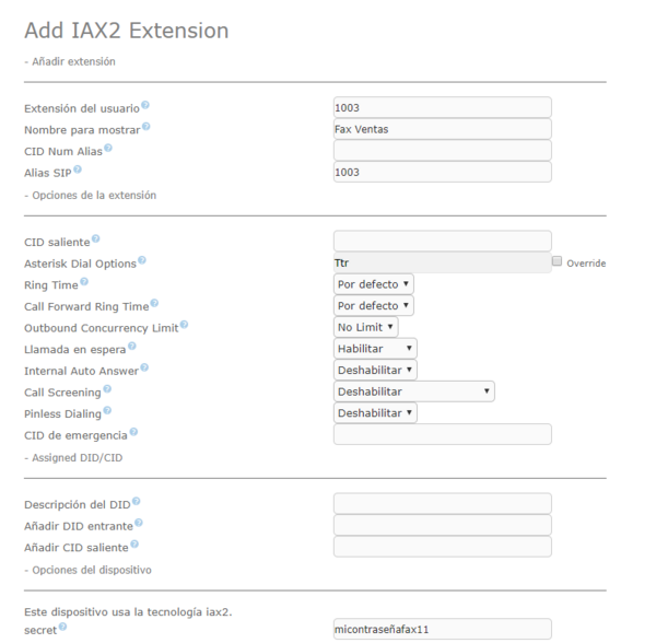 - Secreto (IAX) → la contraseña que pusimos al crear la extensión del fax