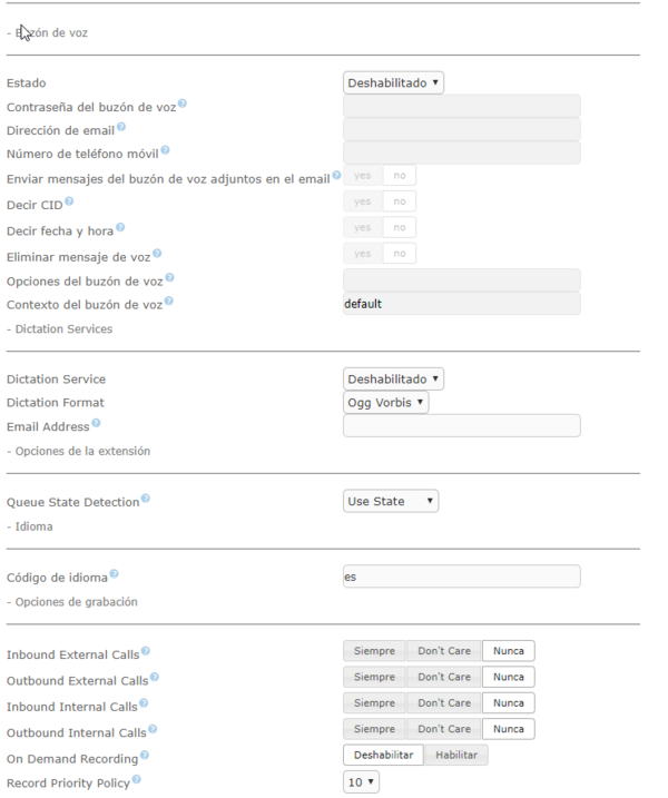 Ponemos el número de extensión y dejamos los valores por defecto, excepto los de idioma que ponemos es, secret que ponemos una contraseña y los de grabación de llamadas que los deshabilitamos