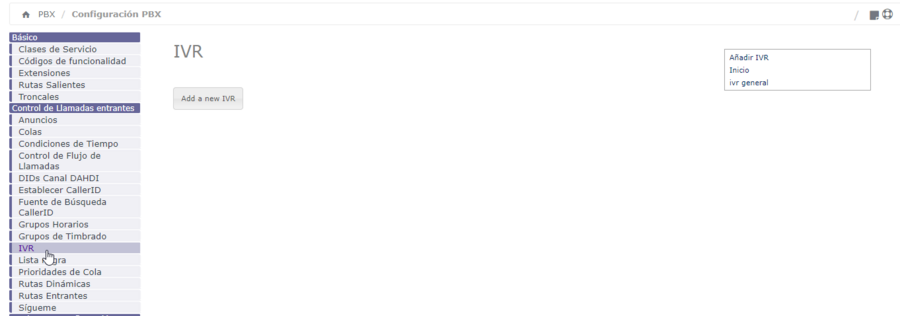 Para crear un IVR desde la interfaz web pinchamos en PBX→Configuración PBX → IVR