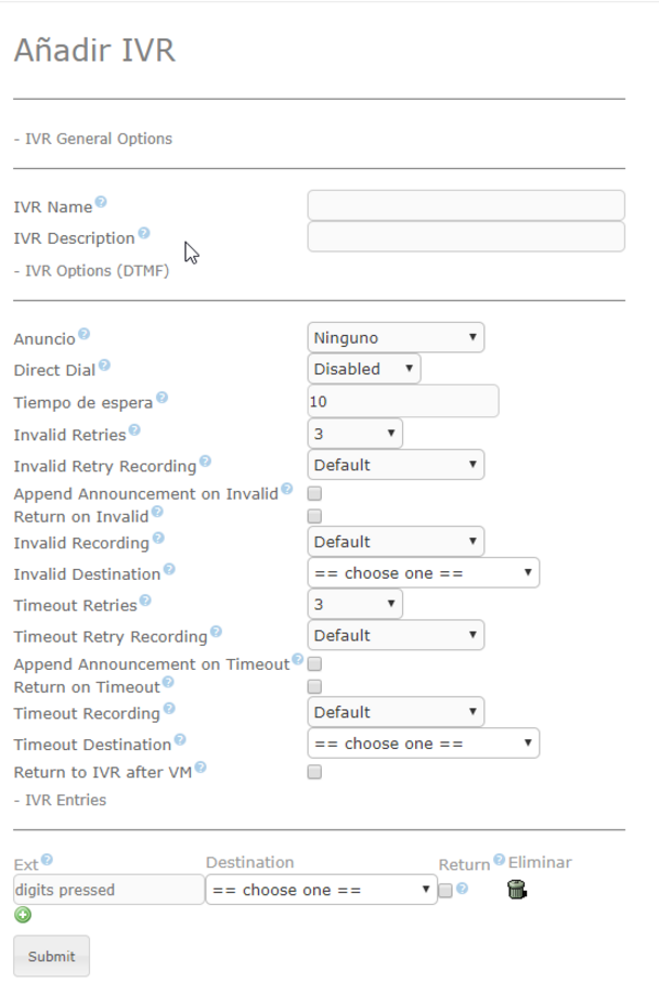 Al pinchar en el botón Add new IVR nos aparece el siguiente formulario.