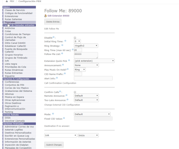 Una vez creado el IVR necesitamos asignarlo a una extensión, en mi caso he creado una y en la opción de Follow Me le he indicado que vaya al IVR que he creado