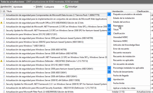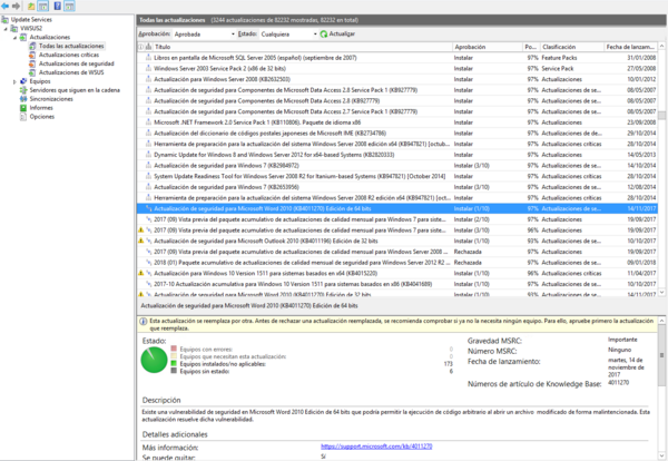 Lo primero que tenemos que hacer es abrir la consola de servidor wsus → Actualizaciones → Todas la actualizaciones Como filtros marcamos las que estan Aprobadas y en estado Cualquiera.